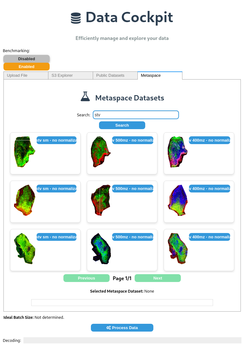 When selecting a dataset in Data Cockpit, you can manually adjust batch sizes using the Batch Size Slider or enable Benchmarking to automatically determine the ideal batch size based on your dataset and processing function.